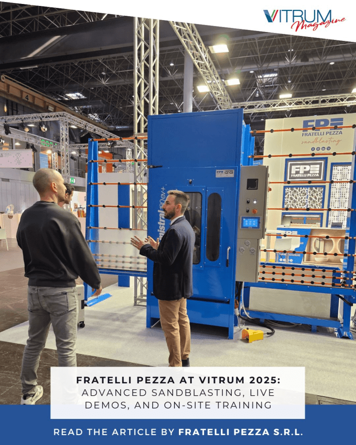 FRATELLI PEZZA社は、VITRUM 2025にて最新鋭の自動ガラスサンドブラスト装置「Mistral EV+」シリーズを発表し、技術革新と創造性の融合によって多くの来場者の目を惹きました。展示の中心となった「Mistral 180EV+」は、同社の長年にわたる技術蓄積と現場ニーズへの深い理解を反映した最新モデルであり、精度・効率・創造性のすべてを高次元で融合した装置として注目を集めました。