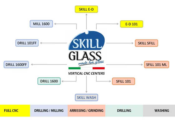 イタリアに本社を置く SKILL GLASS社 は、縦型ガラス加工機の専門メーカーです。豊富な経験を基に、研磨・穴あけ・ミーリング加工などを高精度で行うCNCマシンを開発し、スペース効率と操作性に優れた製品を提供しています。