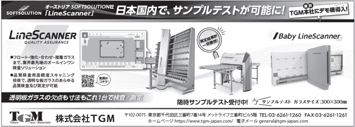 TGM(東京都千代田区、弘中崇社長、03・6261・1260)は、オーストリア・ソフトソリューション社のガラスの欠点を検査する「LineScanner(ラインスキャナー)」、ガラスの反りを検査する「BowScanner(ボウスキャナー)」を販売している。このほど、本社に「ラインスキャナー」のデモ機を導入。国内でよりスピーディーに、ソフトソリューション社の最新ガラス品質検査装置を使ってサンプルテストの実施が可能になる。