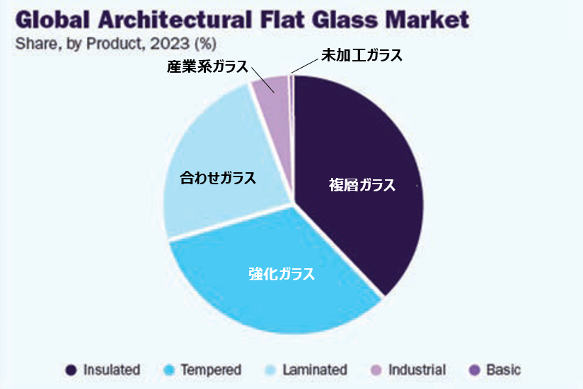 2023年には、複層ガラスは売上高ベースで最大の市場シェアを占め、総売上の38.22%を占めました。熱伝導を低減することでエネルギー効率を高める能力が、最新の建築物で支持される主な理由であり、冷暖房のエネルギー消費削減に大きな効果を発揮します。省エネ建築手法を重視する規制の取り組みは、今後数年間で複層ガラスの需要をさらに押し上げると予想されます。一方、強化ガラス分野は、今後数年間で年平均成長率(CAGR)3.8%の成長が予測されています。同厚の通常ガラスに比べ約2.5倍の強度を持ち、地震、サーマルロード(熱負荷)、強風など環境負荷、機械的負荷がかかる用途に最適です。安全性と性能の両面から建設用ガラスとして頻繁に採用されています。