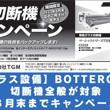 【ガラス設備】BOTTERO社:切断機全般が対象8月末までキャンペーン